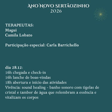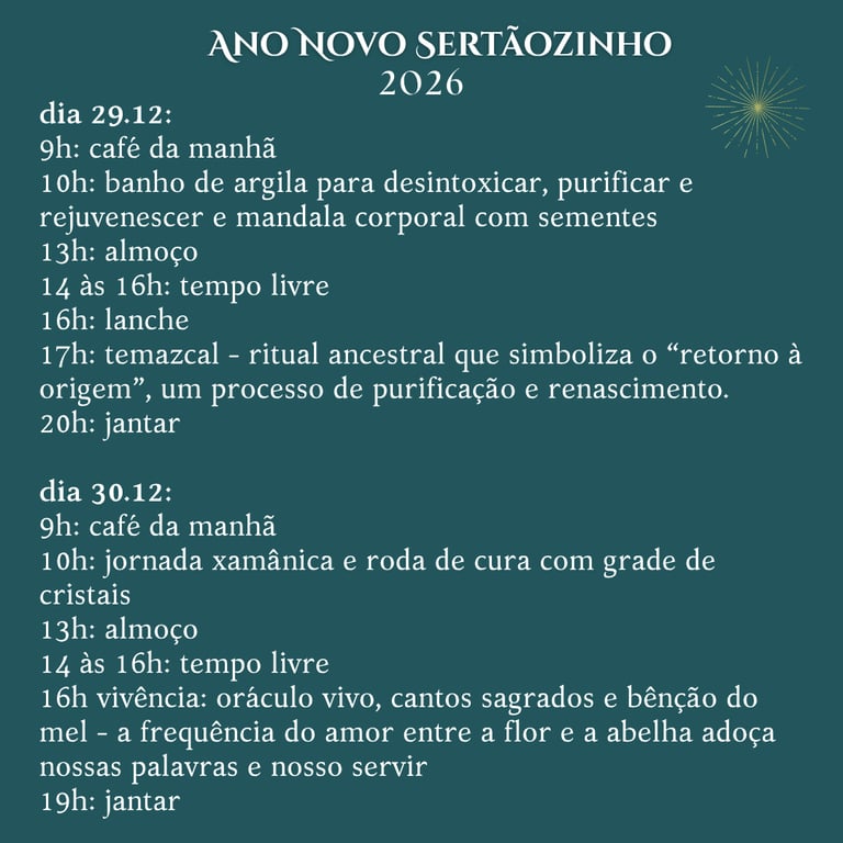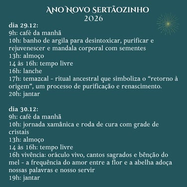 Serão dias de descanso, relaxamento, limpeza e nutrição de recônditos de nossas almas que precisam ser visitados, ouvidos e nutridos.