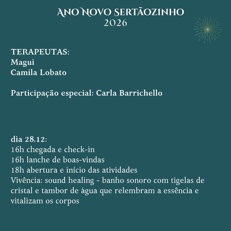 Durante o ano novo, a Walquiria Rosa, estará presente e disponível para atendimentos. Os valores de cada sessão serão combinados diretamente com ela e não estão incluídos no valor abaixo. Walquíria é uma terapeuta excelente e com muita experiência. Você poderá escolher entre o Tarô terapêutico, constelação familiar individual, e a sessão de terapias energéticas e vibracionais com Apometria: trabalho com energias e dimensões que vão além do corpo físico, em um campo que combina espiritualidade, multidimensionalidade; Beamer light pen - alinhamento de chacras, meridianos e outras possibilidades de equilíbrio energético; Barra de acess; Reike e/ou Reset.